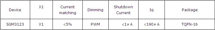 SGM3123作為圣邦微電子新近推出的低壓差模式白光LED燈驅(qū)動,相對市場上現(xiàn)有同類產(chǎn)品在性能上做了充分的改善,壓差降低到30mA電流條件下小于90mV,可以完美支持4顆LED在較低的電池電壓下(<3.5V)穩(wěn)定工作,工作電壓為2.5~5.5V,通道間電流誤差小于5%,可以實現(xiàn)較高的通道亮度匹配度。支持PWM調(diào)光,建議頻率在200Hz~10kHz,啟動時間小于10μS(PWM頻率200HZ),關(guān)斷模式下,靜態(tài)電流小于1μA,可以充分滿足各種便攜產(chǎn)品的應(yīng)用。